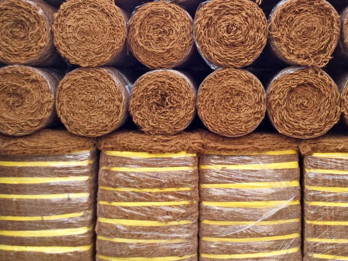 Geotextilien, auch bekannt als Kokosfasernetze, sind ein ideales Mittel zur Bodenerosionskontrolle. Sie werden entweder aus maschinell gesponnenen oder handgesponnenen Zwirnen auf maschinell oder manuell betriebenen Webstühlen hergestellt. Kokosnetze helfen, den Bodenverlust zu verringern, und fördern das Wachstum neuer Vegetation.