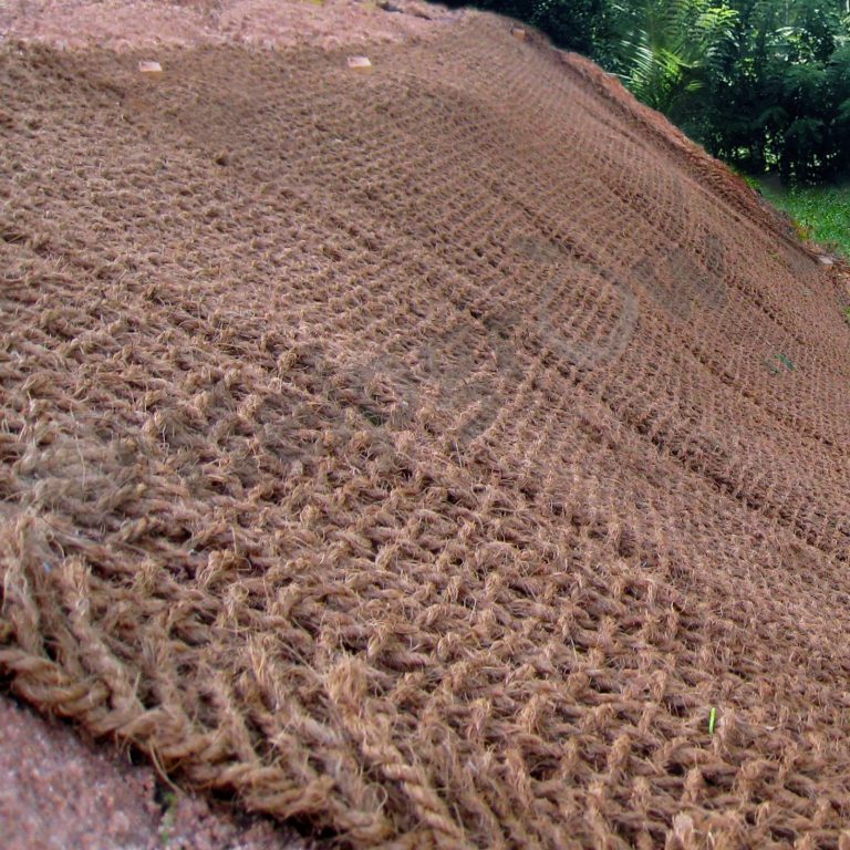 Geotextilien, auch bekannt als Kokosfasernetze, sind ein ideales Mittel zur Bodenerosionskontrolle. Sie werden entweder aus maschinell gesponnenen oder handgesponnenen Zwirnen auf maschinell oder manuell betriebenen Webstühlen hergestellt. Kokosnetze helfen, den Bodenverlust zu verringern, und fördern das Wachstum neuer Vegetation.
